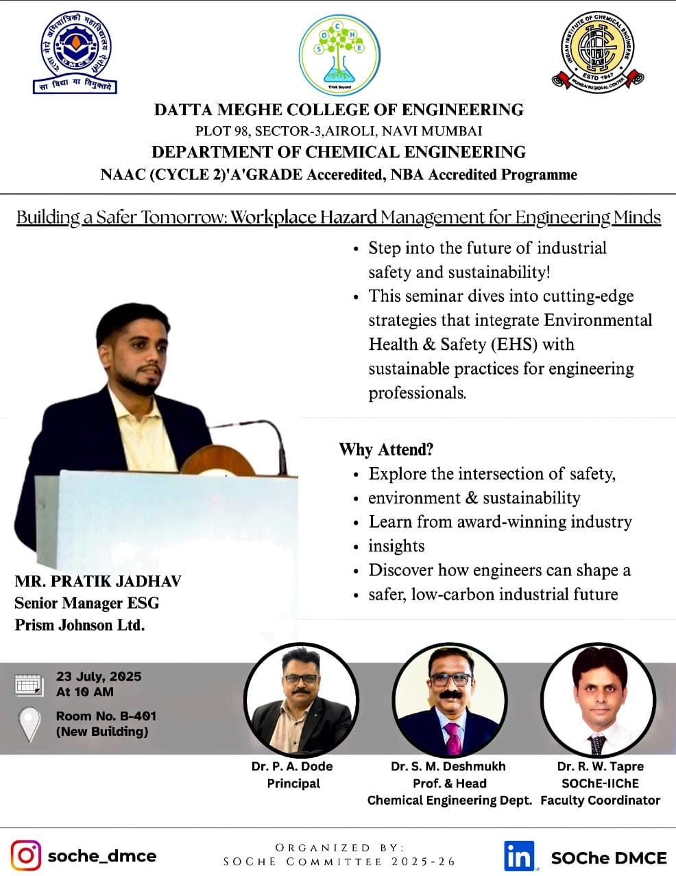 Hearty welcome to the Department of Chemical Engineering at Datta Meghe College of Engineering, Airoli, Navi Mumbai. The course leading to a bachelor’s degree in chemical engineering was started in the year 1999. The department has evolved since then with leaps and bounds in terms of faculty expertise, infrastructure, and quality of education and student performance. The department is a vibrant place with 09 full-time academic staff from reputed institutions, including IIT and ICT Mumbai, and dedicated supporting staff (all faculty are PhD holders in their respective fields of specialization).The Department of Chemical Engineering is NBA accredited for three years, i.e., from academic session 2023-24 up to 2025-26.